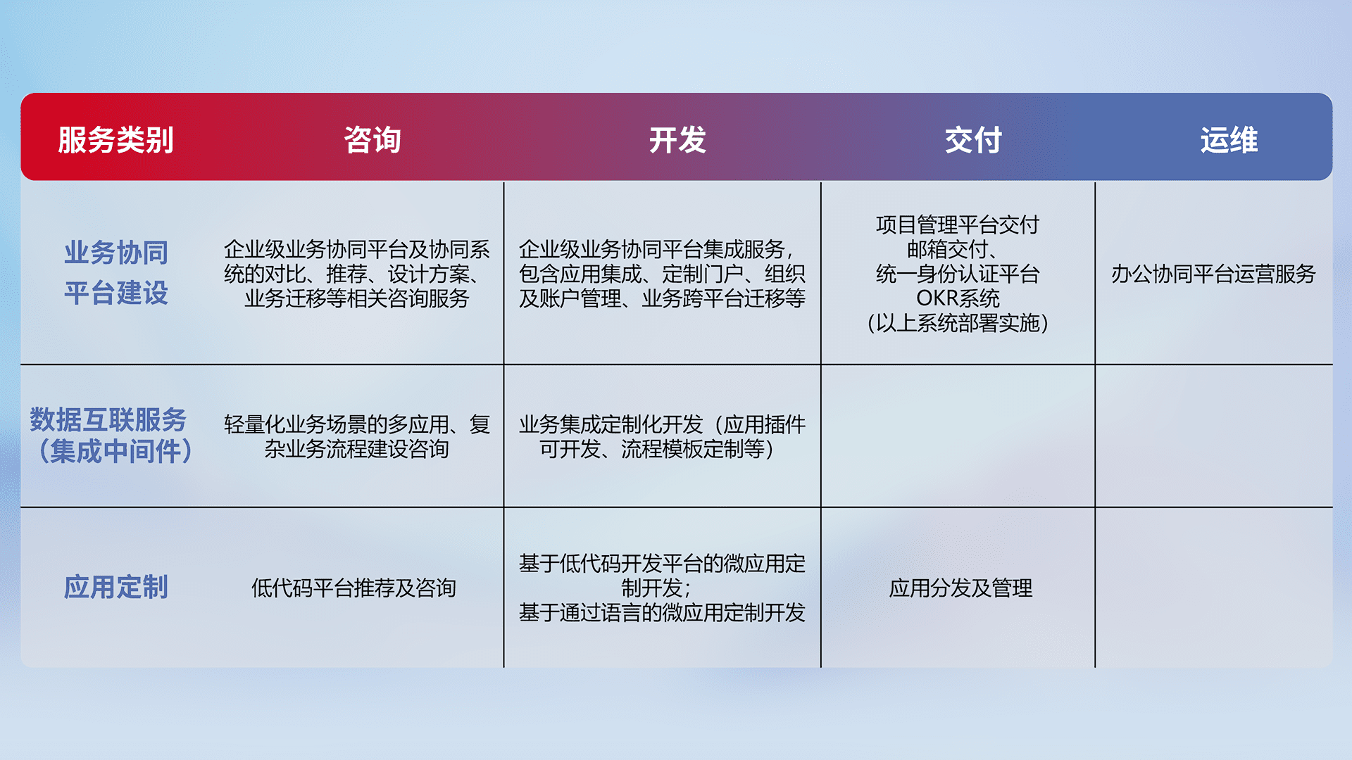 针对钉钉、、、、企微、、、IDaas等平台级产品提供产品的规划、、、方案、、、交付、、、、定制化开发等服务,,实现如统一协同办公、、、智能客户服务、、、、混合会议管理、、智能数据查询、、等业务场景,,实现数字化转型。。。